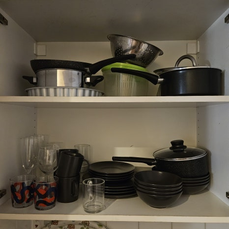 수납장에는 각종 그릇과 냄비들.