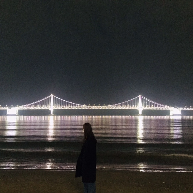 밤 12시 넘어서 바다 구경하러 나갔다. 그런데도 불켜진 건물도 많고 밤의 광안리를 즐기는 사람들도 몇명 보였다.